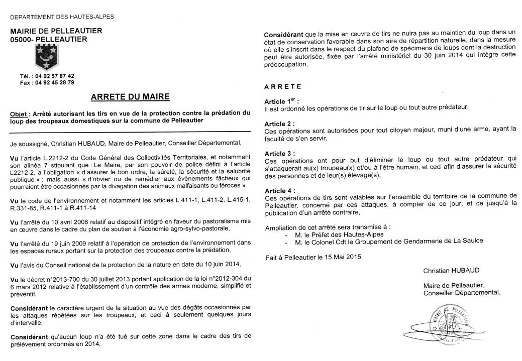 Le maire de Pelleautier, Christian Hubaud (...) a signé, le 15 mai, un arrêté municipal autorisant « tout citoyen majeur, muni d’une arme, ayant la faculté de s’en servir » à « éliminer le loup ou tout autre prédateur qui s’attaquerait au(x) troupeau(x) et/ou à l’être humain, et ceci afin d’assurer la sécurité des personnes et de leur(s) élevage(s).