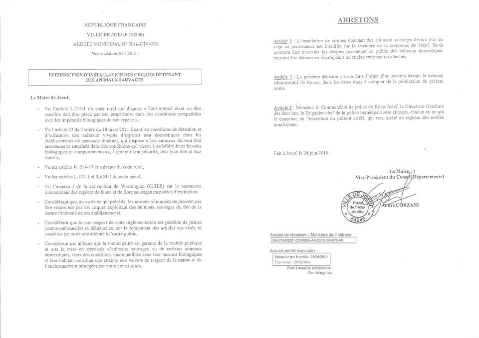 Félicitations à la municipalité de Joeuf qui vient de prendre un arrêté historique, celui d'interdire les cirques avec animaux sauvages sur son territoire. C'est officiel depuis le 24 juin 2016 !