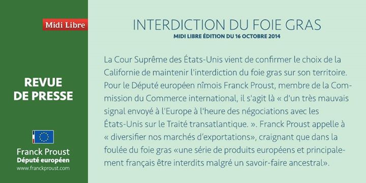 La Cour Suprême des États-Unis vient de confirmer le choix de la Californie de maintenir l'interdiction du foie gras sur son territoire. Pour le député européen nîmois Franck Proust, membre de la Commission du Commerce international, il s'agit là "d'un très mauvais signal envoyé à l'Europe à l'heure des négociations avec les États-Unis sur le Traité transatlantique". Franck Proust appelle à "diversifier nos marchés d'exportations", craignant que dans la foulée du foie gras "une série de produits européens et principalement français être [sic] interdits malgré un savoir-faire ancestral".